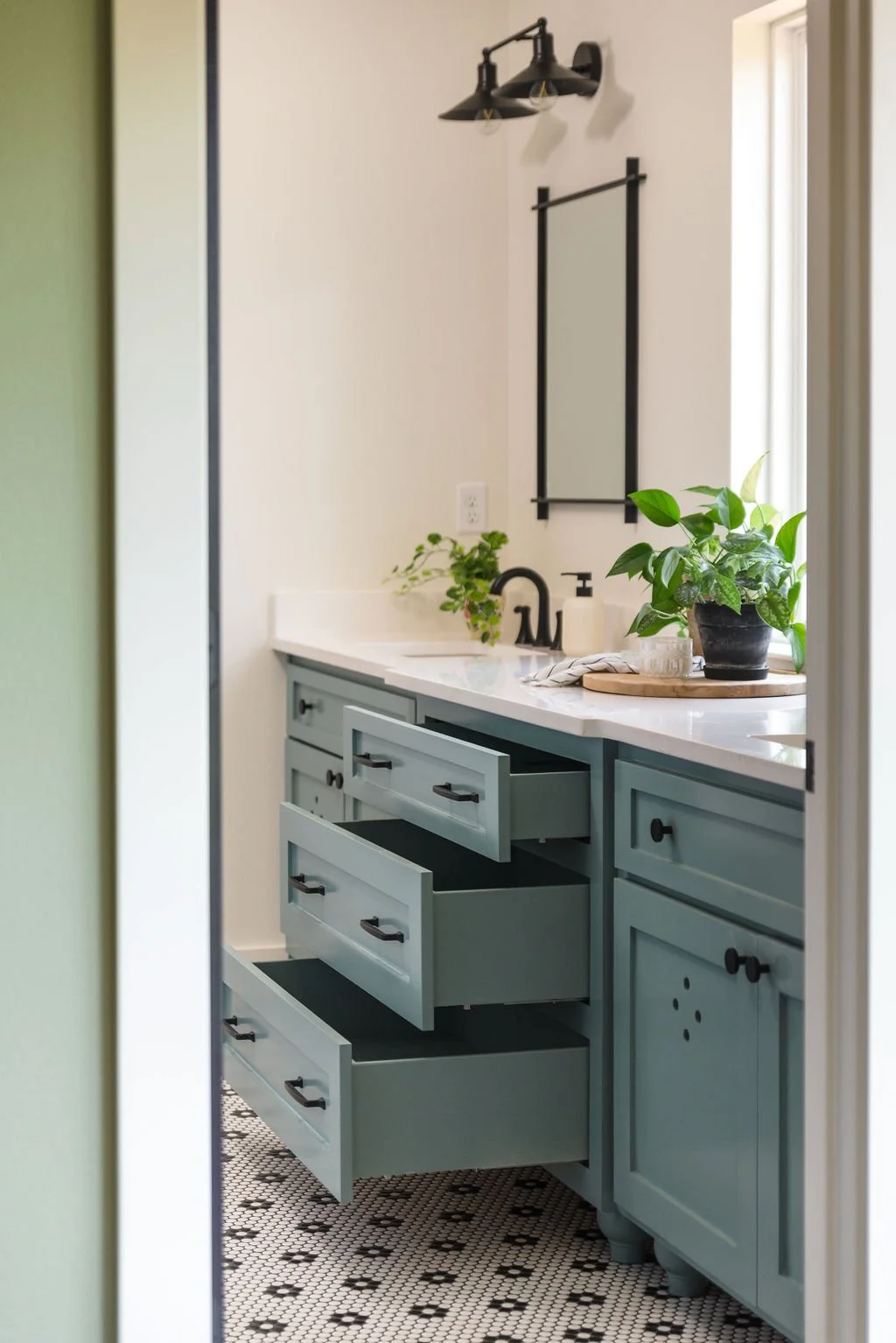Take a peek in from the boys’ bedroom… we love seeing how the green walls coordinate with the bathroom vanity color!